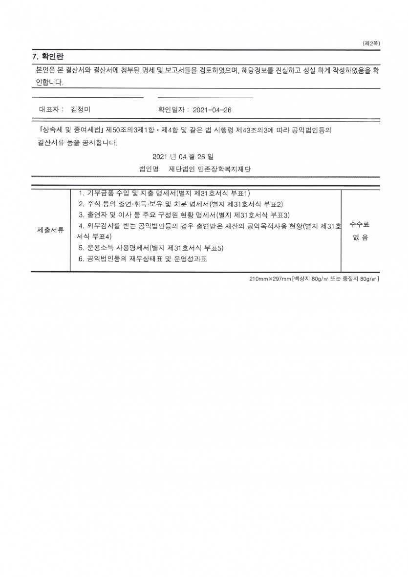 공익법인 결산서류2 페이지 정보 작성자 tntntn 댓글 0건 조회 558회 작성일 21-06-07 14:50 목록 답변 본문 . 이전글공익법인 결산서류1 21.06.07 다음글2020년법인결산(인존장학복지재단) 21.04.29 댓글 0 댓글목록 등록된 댓글이 없습니다.