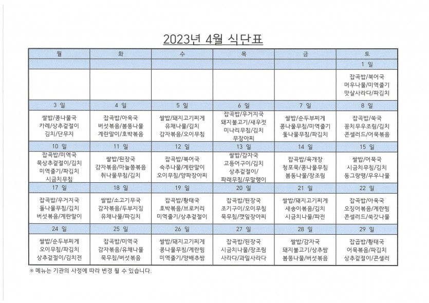 4월 주간보호 식단표 페이지 정보 작성자 tntntn 댓글 0건 조회 577회 작성일 23-04-24 15:20 목록 답변 본문 . 이전글4월 주간보호 생활계획표 23.04.24 다음글2022년도 임실노인복지센터 결산총괄표(방문요양, 재가노인복지서비스) 23.03.28 댓글 0 댓글목록 등록된 댓글이 없습니다.