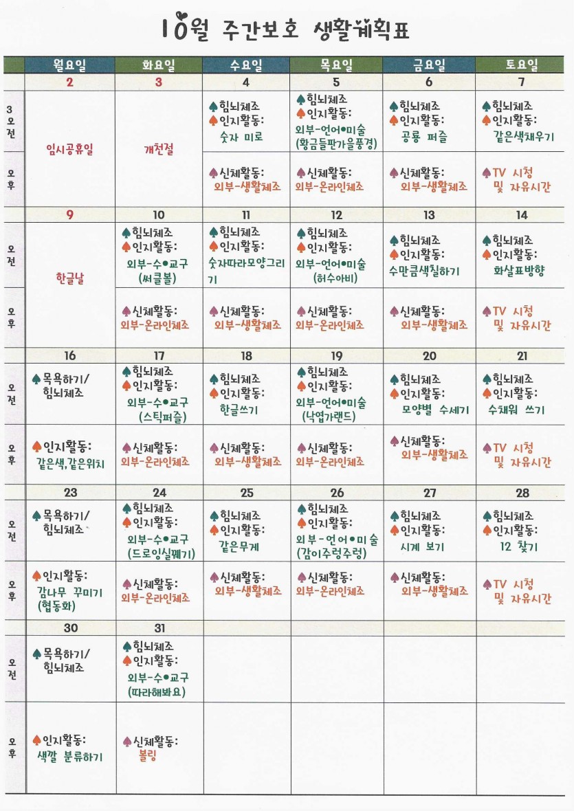 10월 프로그램표 페이지 정보 작성자 강숭 댓글 0건 조회 1,174회 작성일 23-09-27 15:10 목록 답변 본문 주간보호 10월 프로그램표 첨부합니다 이전글10월 식단표 23.09.27 다음글9월 식단표 23.09.01 댓글 0 댓글목록 등록된 댓글이 없습니다.