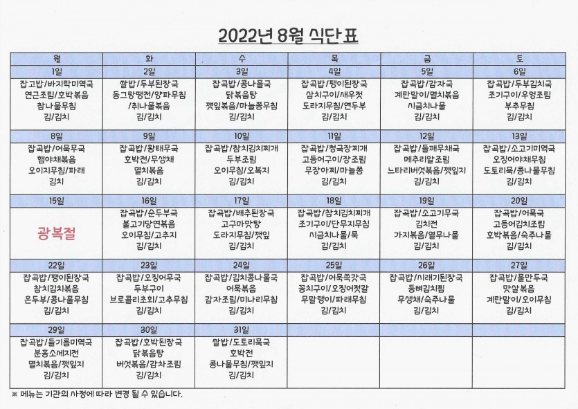 8월 식단표 페이지 정보 작성자 강숭 댓글 0건 조회 1,175회 작성일 22-08-01 10:24 목록 답변 본문 8월 식단표입니다 이전글8월 프로그램표 22.08.01 다음글7월 식단표 22.07.01 댓글 0 댓글목록 등록된 댓글이 없습니다.