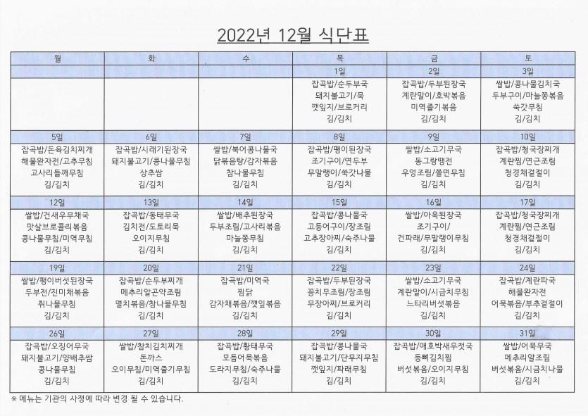 12월 식단표 페이지 정보 작성자 강숭 댓글 0건 조회 1,112회 작성일 22-12-01 15:18 목록 답변 본문 12월 식단표입니다 이전글주간보호 이용자 월 한도액 추가 산정 기준 변경 안내문 22.12.26 다음글12월 프로그램표 22.12.01 댓글 0 댓글목록 등록된 댓글이 없습니다.