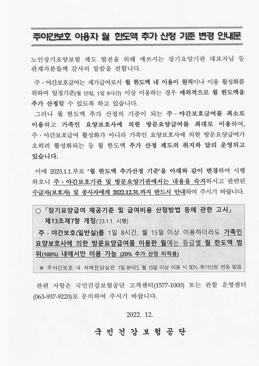 주간보호 이용자 월 한도액 추가 산정 기준 변경 안내문 페이지 정보 작성자 강숭 댓글 0건 조회 1,156회 작성일 22-12-26 14:05 목록 답변 본문 주간보호 이용자 월 한도액 추가 산정 기준 변경 안내문입니다 이전글2023년도 장기요양 수가변경안내 22.12.26 다음글12월 식단표 22.12.01 댓글 0 댓글목록 등록된 댓글이 없습니다.