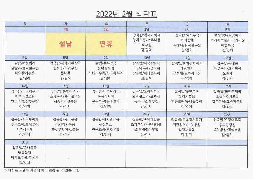 2월 식단표 페이지 정보 작성자 강숭 댓글 0건 조회 1,154회 작성일 22-02-03 10:46 목록 답변 본문 2월 식단표입니다 이전글2월 프로그램표 22.02.03 다음글2022년도 등급수가변경 안내 입니다 22.01.03 댓글 0 댓글목록 등록된 댓글이 없습니다.