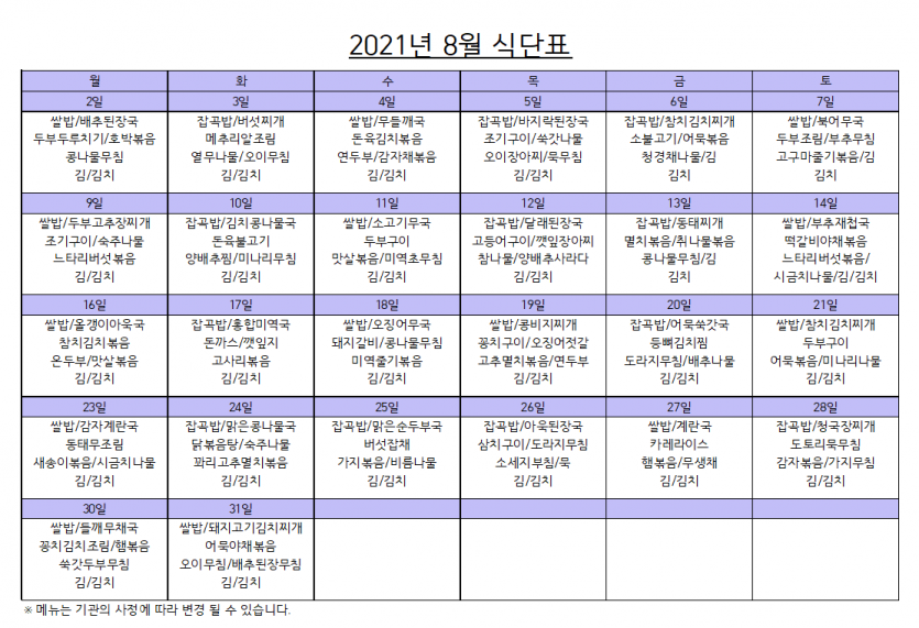 8월 식단표 페이지 정보 작성자 강숭 댓글 0건 조회 1,358회 작성일 21-08-02 13:36 목록 답변 본문 8월 식단표입니다 이전글9월 프로그램표 21.09.01 다음글8월 프로그램표 21.08.02 댓글 0 댓글목록 등록된 댓글이 없습니다.