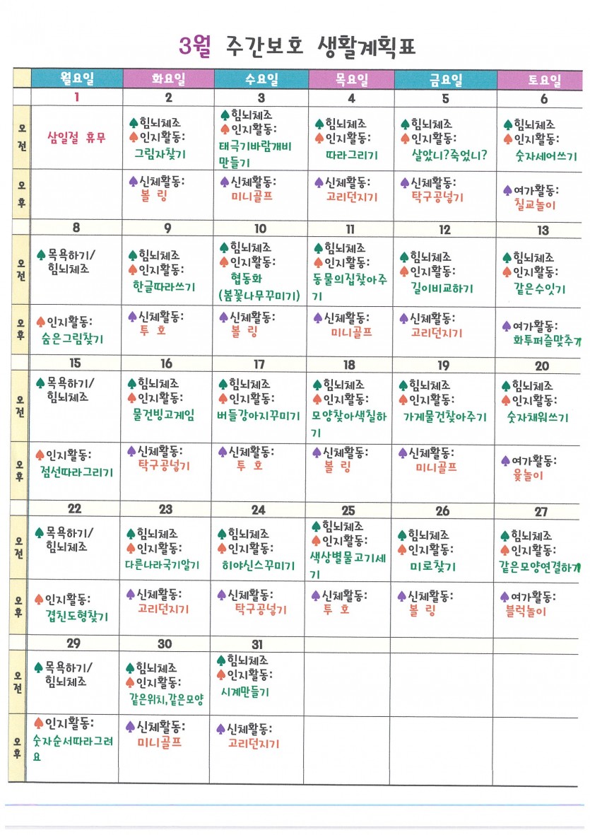 3월 프로그램계획표 페이지 정보 작성자 tntntn 댓글 0건 조회 1,082회 작성일 21-03-02 10:13 목록 답변 본문 3월프로그램~ 이전글4월 주간보호 생활계획표 21.04.01 다음글3월식단표 21.03.02 댓글 0 댓글목록 등록된 댓글이 없습니다.