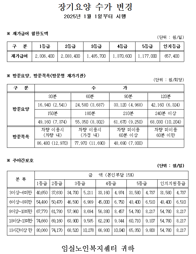 2025년도 장기요양 수가변경안내 페이지 정보 작성자 강숭 댓글 0건 조회 382회 작성일 25-01-02 10:34 목록 답변 본문 2025년도 장기요양 수가변경안내입니다. 이전글2025년 임실노인복지센터 장기요양 이용 계약에 관한 사항 25.01.02 다음글12월 식단표 24.12.02 댓글 0 댓글목록 등록된 댓글이 없습니다.