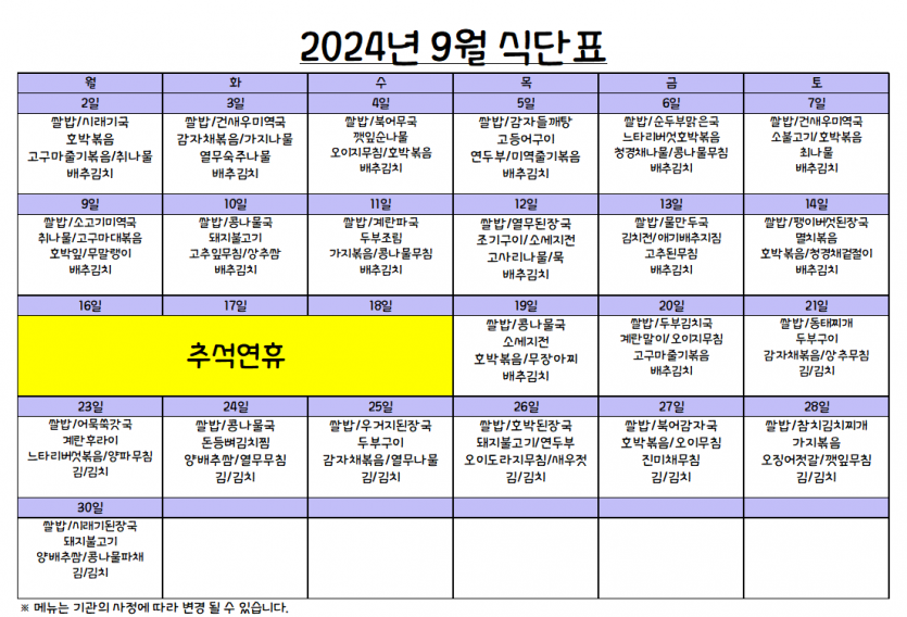 9월 식단표 페이지 정보 작성자 강숭 댓글 0건 조회 966회 작성일 24-09-05 11:27 목록 답변 본문 9월 식단표입니다 이전글9월 프로그램표 24.09.05 다음글8월 프로그램표 24.08.08 댓글 0 댓글목록 등록된 댓글이 없습니다.