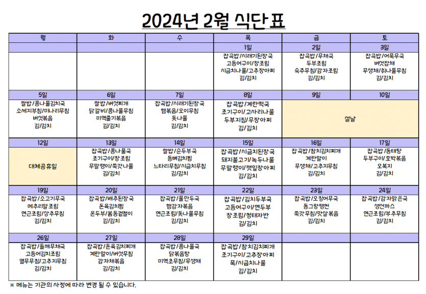 2월 식단표 페이지 정보 작성자 강숭 댓글 0건 조회 1,039회 작성일 24-02-05 13:32 목록 답변 본문 2월 식단표입니다 이전글2월 프로그램표 24.02.05 다음글2024년도 장기요양 수가변경안내 24.01.09 댓글 0 댓글목록 등록된 댓글이 없습니다.