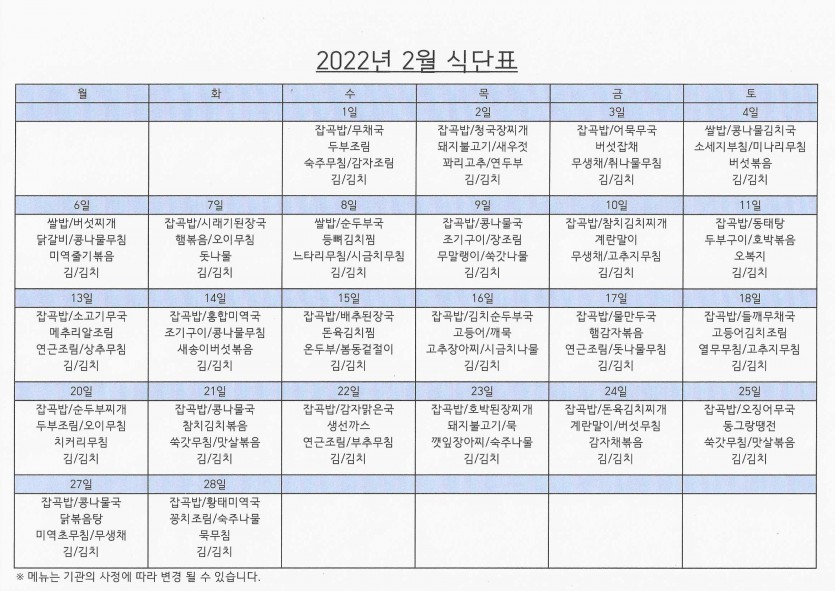 2월 식단표 페이지 정보 작성자 강숭 댓글 0건 조회 1,067회 작성일 23-01-27 16:07 목록 답변 본문 2월 식단표입니다 이전글5월주간보호식단표 23.05.12 다음글2023년 임실노인복지센터 장기요양 이용 계약에 관한 사항 23.01.02 댓글 0 댓글목록 등록된 댓글이 없습니다.