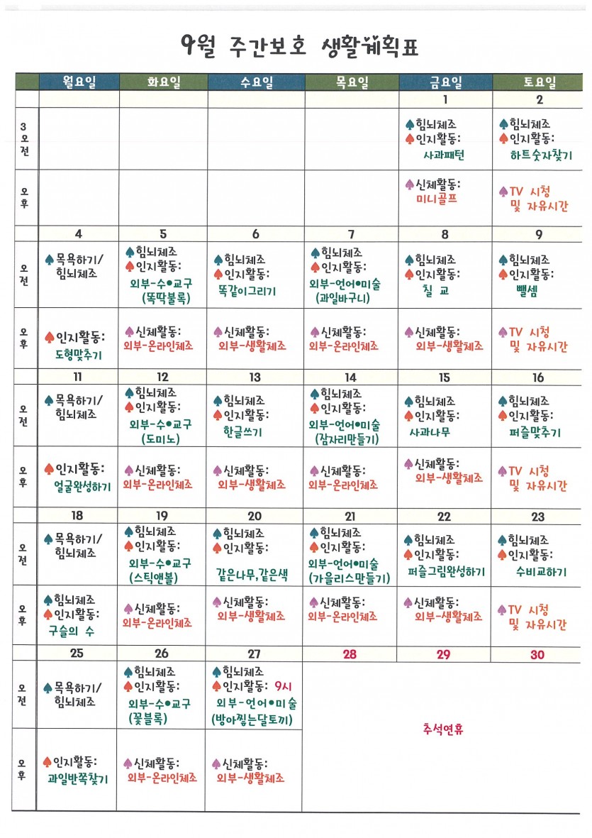 9월 주간보호 생활계획표 페이지 정보 작성자 강숭 댓글 0건 조회 1,193회 작성일 23-09-01 14:39 목록 답변 본문 9월 주간보호 생활계획표입니다 이전글9월 식단표 23.09.01 다음글8월 주간보호 생활계획표 23.08.01 댓글 0 댓글목록 등록된 댓글이 없습니다.