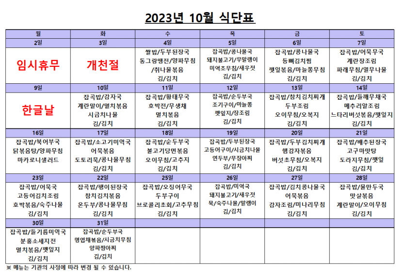 10월 식단표 페이지 정보 작성자 강숭 댓글 0건 조회 1,036회 작성일 23-09-27 15:10 목록 답변 본문 10월 식단표 첨부합니다 이전글11월 프로그램표 23.11.14 다음글10월 프로그램표 23.09.27 댓글 0 댓글목록 등록된 댓글이 없습니다.