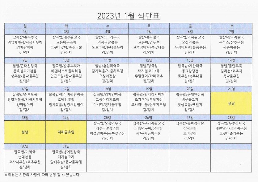 1월 식단표 페이지 정보 작성자 강숭 댓글 0건 조회 1,027회 작성일 23-01-02 11:08 목록 답변 본문 식단표입니다 이전글1월 프로그램표 23.01.02 다음글2023년도 장기요양 수가변경안내 22.12.26 댓글 0 댓글목록 등록된 댓글이 없습니다.