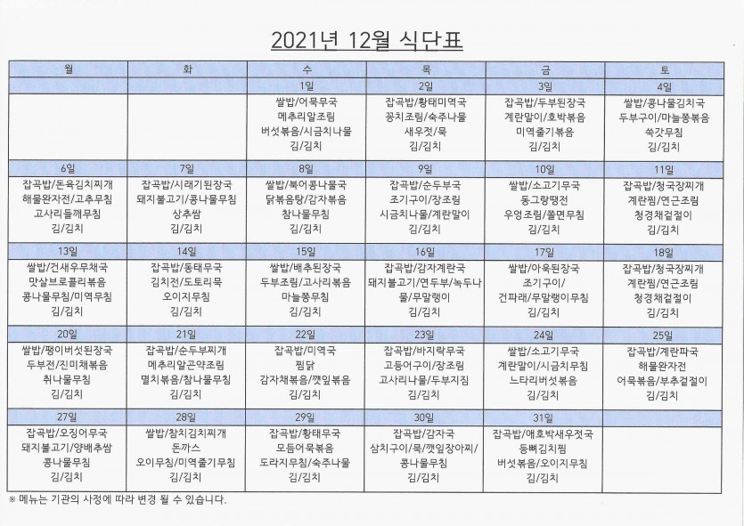 12월 식단표 페이지 정보 작성자 강숭 댓글 0건 조회 1,062회 작성일 21-11-30 14:36 목록 답변 본문 12월 식단표입니다 이전글1월 프로그램표 22.01.03 다음글12월 프로그램표 21.11.30 댓글 0 댓글목록 등록된 댓글이 없습니다.