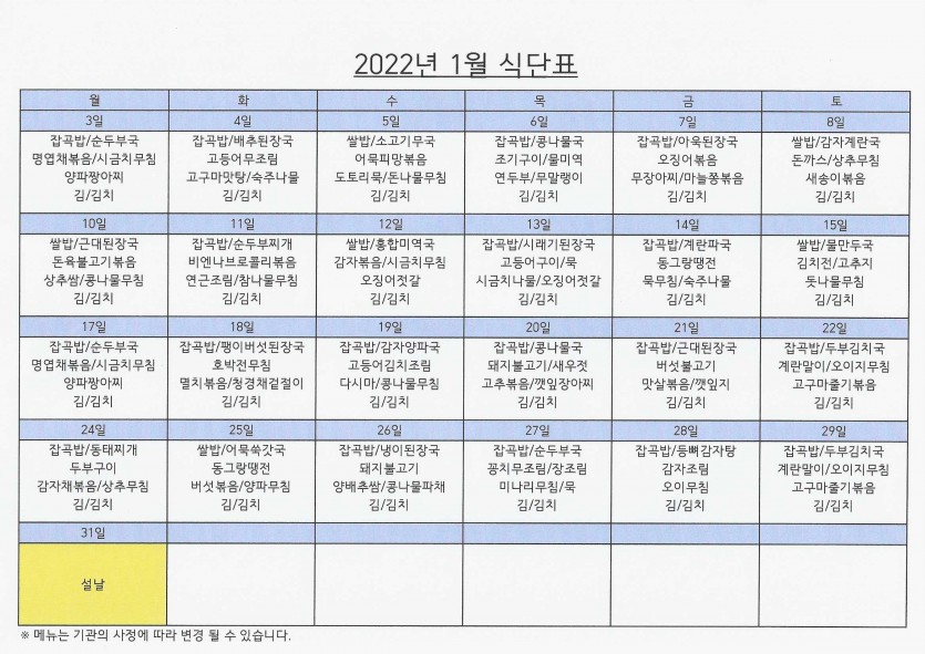 1월 식단표 페이지 정보 작성자 강숭 댓글 0건 조회 1,272회 작성일 22-01-03 10:35 목록 답변 본문 1월 식단표입니다 이전글2022년도 등급수가변경 안내 입니다 22.01.03 다음글1월 프로그램표 22.01.03 댓글 0 댓글목록 등록된 댓글이 없습니다.