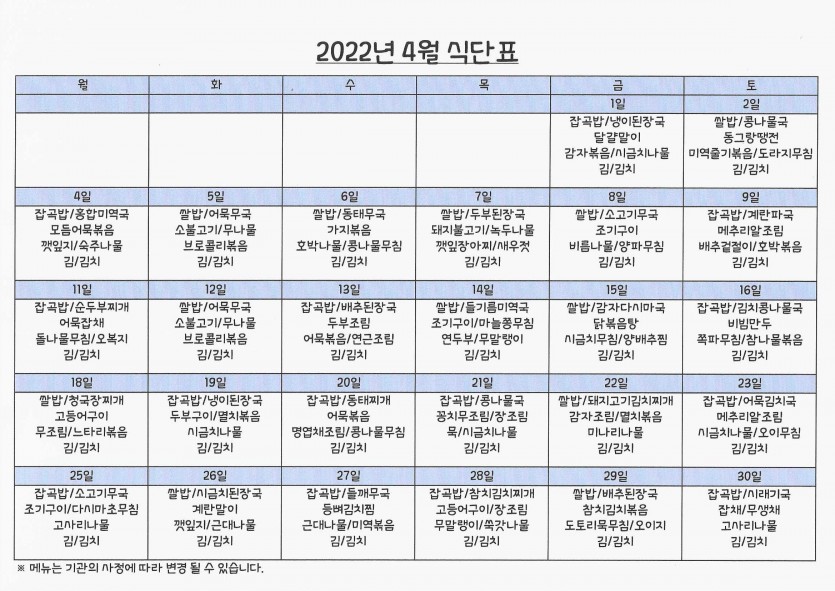 4월 식단표 페이지 정보 작성자 강숭 댓글 0건 조회 1,095회 작성일 22-03-31 14:51 목록 답변 본문 4월 식단표입니다 이전글4월 프로그램표 22.03.31 다음글3월 식단표 22.03.03 댓글 0 댓글목록 등록된 댓글이 없습니다.