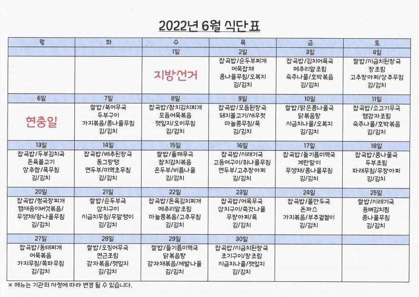 6월 식단표 페이지 정보 작성자 강숭 댓글 0건 조회 1,142회 작성일 22-06-02 11:46 목록 답변 본문 6월 식단표입니다 이전글7월 프로그램표 22.07.01 다음글6월 프로그램표 22.06.02 댓글 0 댓글목록 등록된 댓글이 없습니다.