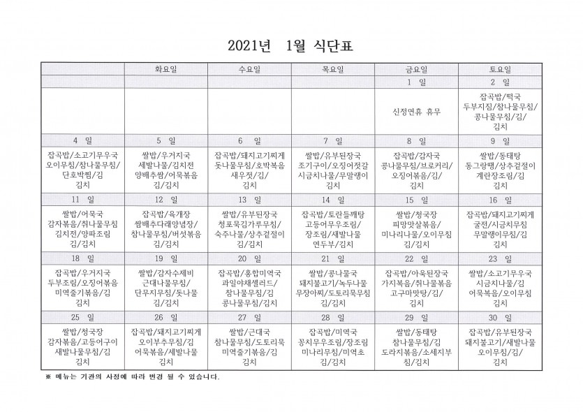 2021년 1월 임실노인복지센터 주간보호 식단표 페이지 정보 작성자 tntntn 댓글 0건 조회 1,104회 작성일 21-01-05 09:44 목록 답변 본문 주간보호식단표 이전글2021년 장기요양 수가변경표 21.01.05 댓글 0 댓글목록 등록된 댓글이 없습니다.