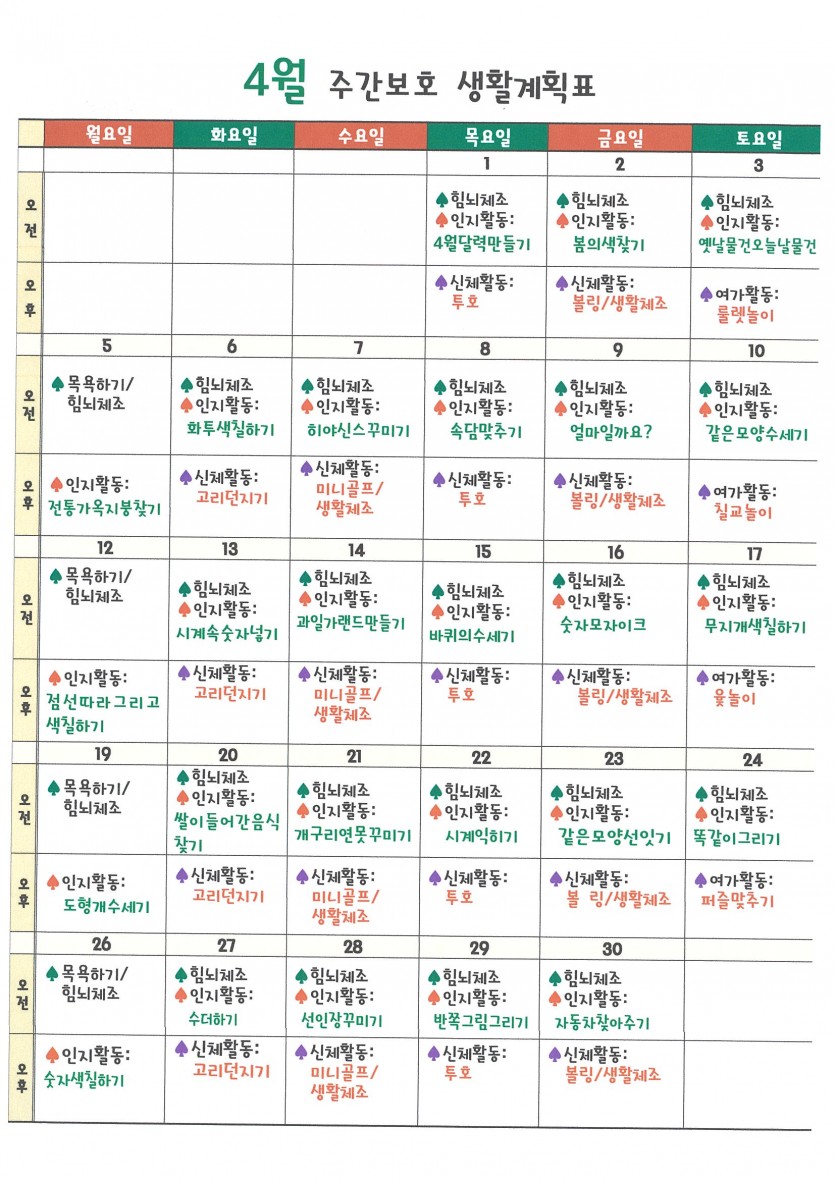 4월 주간보호 생활계획표 페이지 정보 작성자 tntntn 댓글 0건 조회 1,097회 작성일 21-04-01 11:09 목록 답변 본문 4월 이전글4월 식단표 21.04.01 다음글3월 프로그램계획표 21.03.02 댓글 0 댓글목록 등록된 댓글이 없습니다.