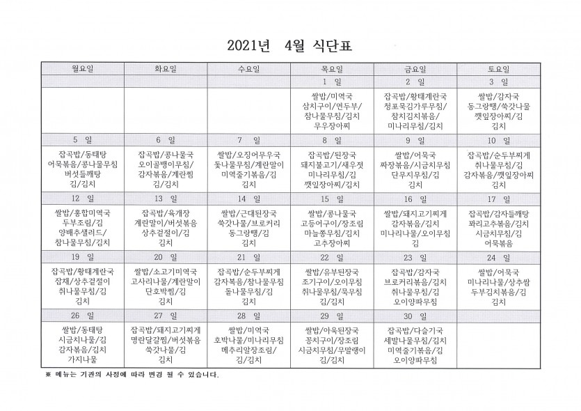 4월 식단표 페이지 정보 작성자 tntntn 댓글 0건 조회 1,099회 작성일 21-04-01 11:10 목록 답변 본문 4월 이전글5월주간보호 프로그램계획표 21.05.06 다음글4월 주간보호 생활계획표 21.04.01 댓글 0 댓글목록 등록된 댓글이 없습니다.