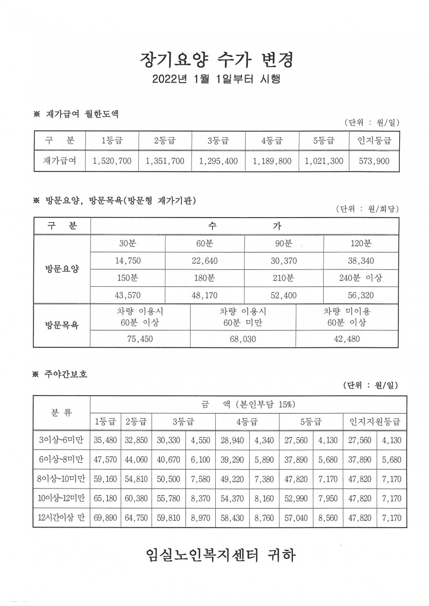 2021년 장기요양 수가변경표 페이지 정보 작성자 tntntn 댓글 0건 조회 1,244회 작성일 21-01-05 09:46 목록 답변 본문 장기요양수가 이전글2021년도 1월 주간보호 생활계획표 21.01.05 다음글2021년 1월 임실노인복지센터 주간보호 식단표 21.01.05 댓글 0 댓글목록 등록된 댓글이 없습니다.